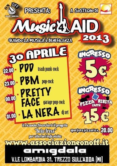 Il ricavato della prima edizione del Music 4 Aid, nel 2011, è stato di 1770 € (1500 € destinati al Salam Centre di Emergency e 200 € all’Associazione Volontari Croce Azzurra di Trezzo sull’Adda).