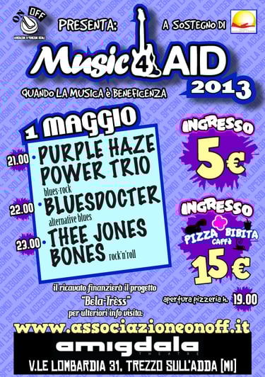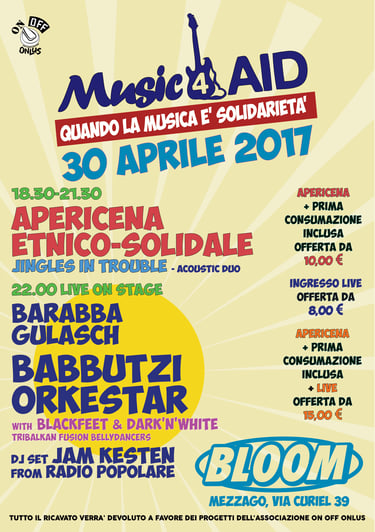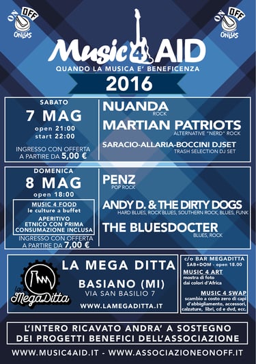 Dal 2015 in poi il Music 4 AID è divenuto l’evento principale di foundraising dell’Associazione ON OFF, andando a sostenere di volta in volta in progetto in essere quel momento.